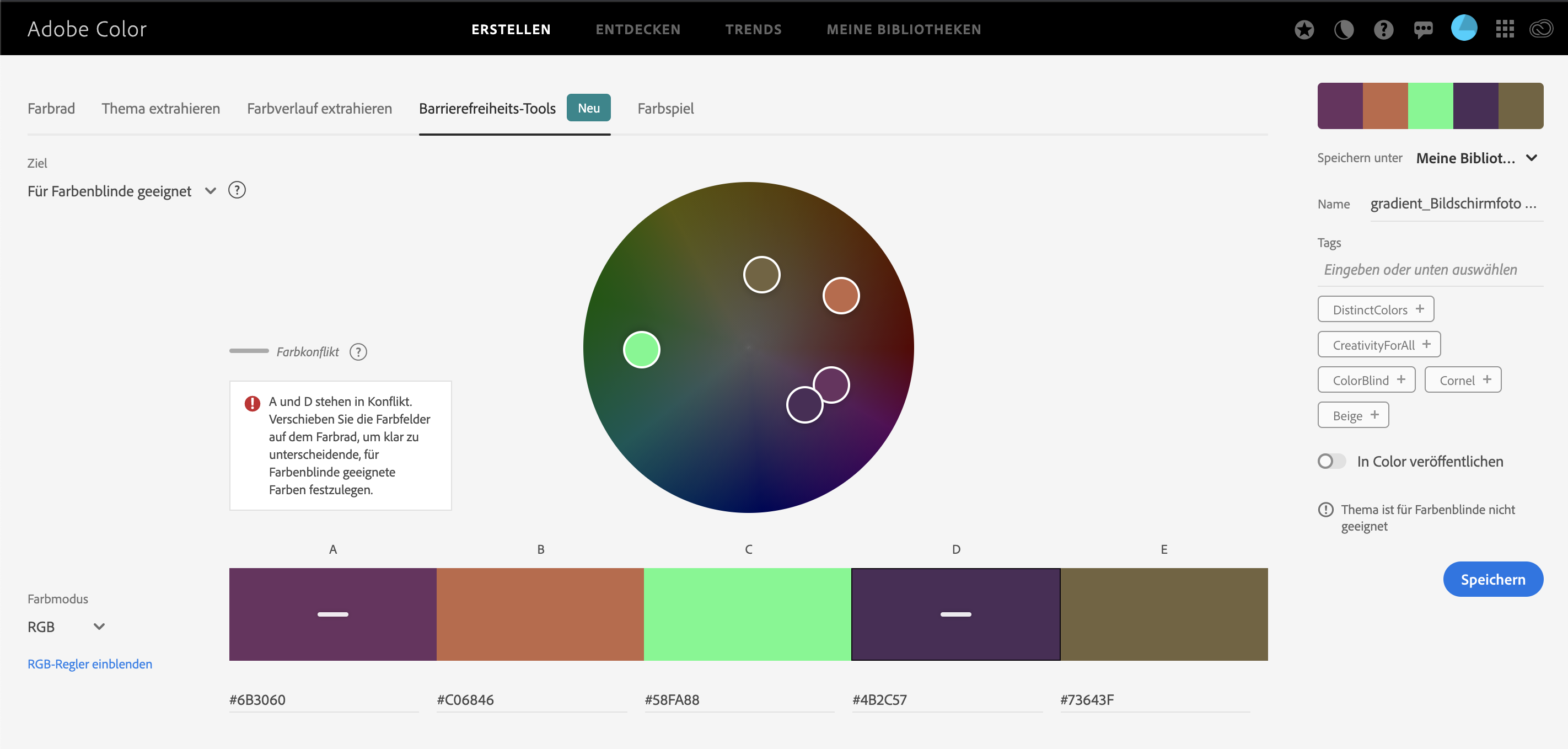 Adobe Color ist der App Adobe Capture sehr ähnlich. Ersteres ist auf dem Computer unter der Website https://color.adobe.com/de/create/color-wheel verfügbar. Dieses Tool ist ebenfalls gratis und man muss sich nicht einmal anmelden, um es nutzen zu können. Falls du deine Farben speichern möchtest, benötigst du ein Adobe Konto. Ein großer Pluspunkt ist ein barrierefreies Tool auf der Website. Dort kannst du überprüfen, ob deine Farbpalette für Farbblinde geeignet ist.